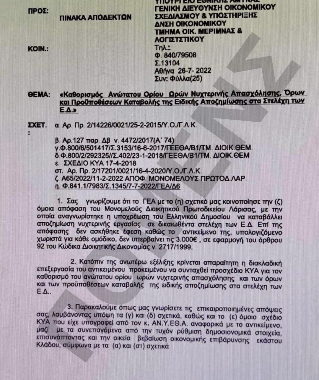 Η Ομοσπονδία μας εδώ και πέντε έτη διεκδικεί την εφαρμογή του νόμου και την καταβολή της αποζημίωσης νυχτερινής εργασίας, όπως έχει νομοθετηθεί και ισχύει εδώ και πολλά έτη για τα Σώματα Ασφαλείας.